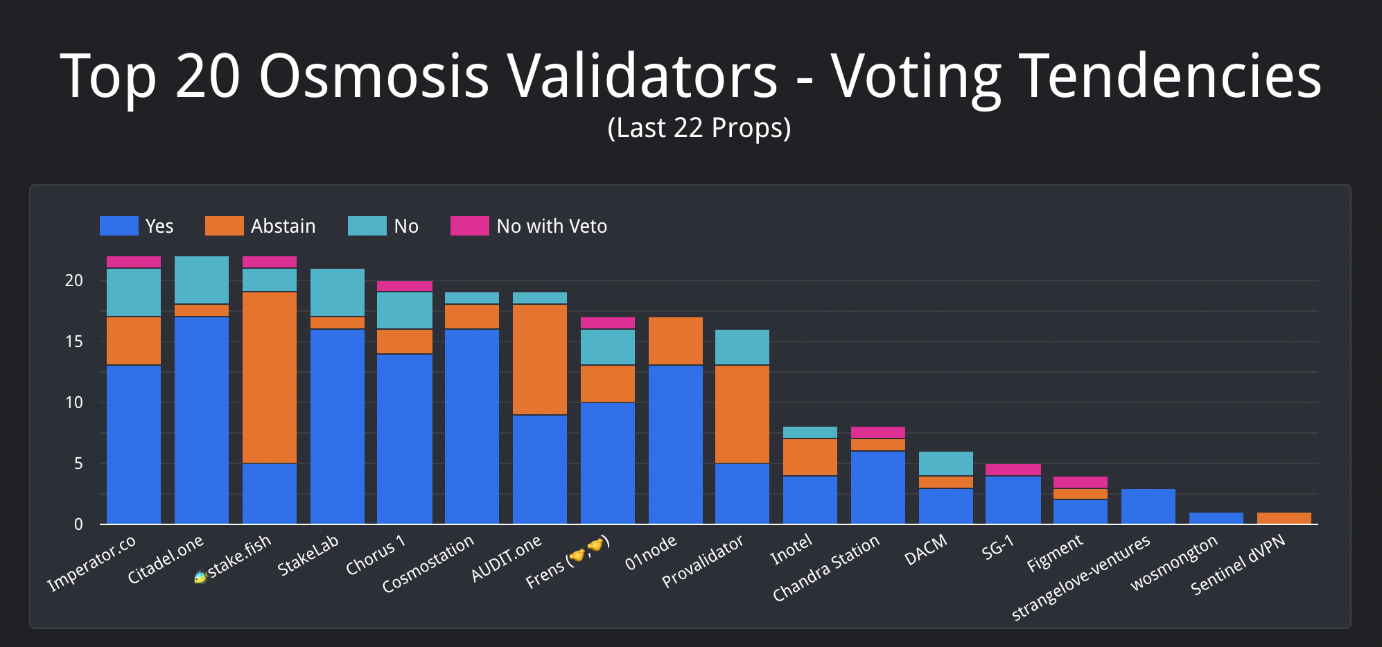 The Validator Voting Dashboard offers a comprehensive view of voting patterns and decisions made by validators across governance proposals. It helps track validator engagement, proposal outcomes, and overall participation in the governance process, making it a useful tool for ecosystem monitoring and analysis.